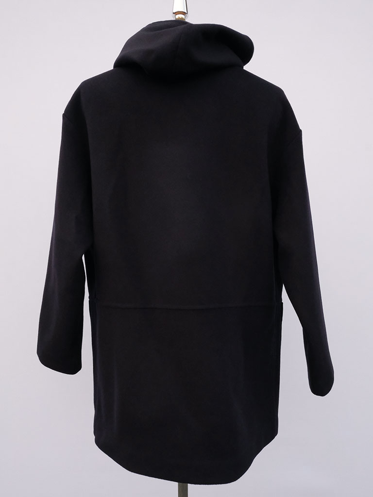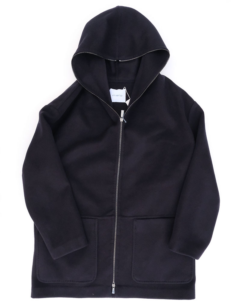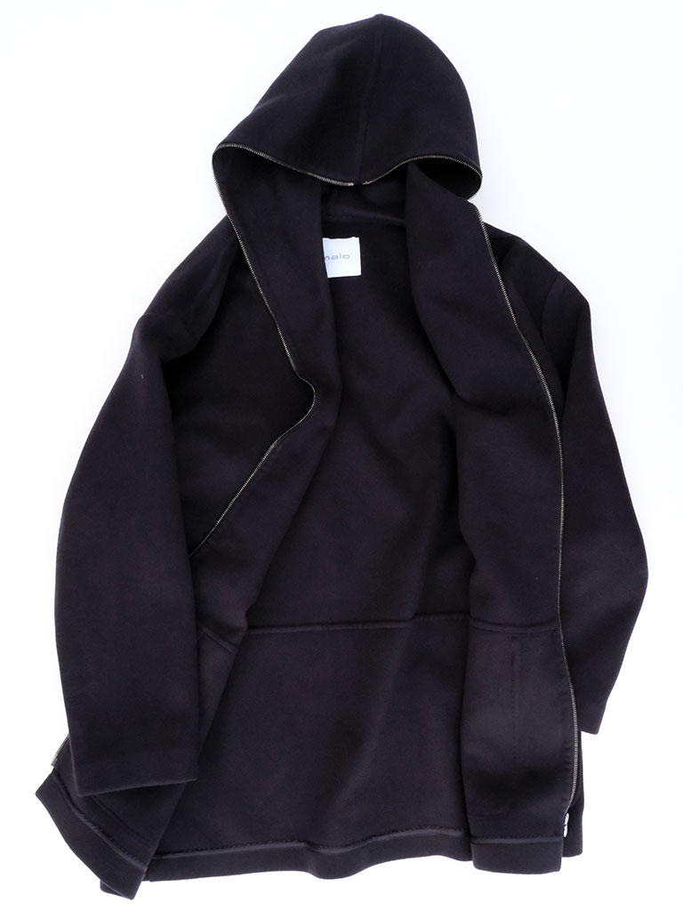 極上の素材感を引き立てるミニマルなデザインと、立体的なフードのバランスが秀逸。袖や裾にかけて自然に広がるラインがポンチョのような印象を与え、ルーズに着こなすほど洗練された雰囲気を演出します。ニットブランドならではの柔らかさと構築的なフォルムが共存する、maloらしいラグジュアリーな仕立て。