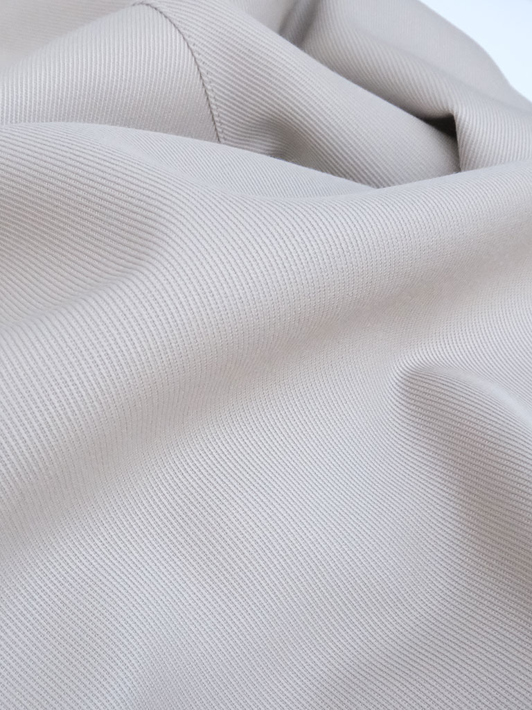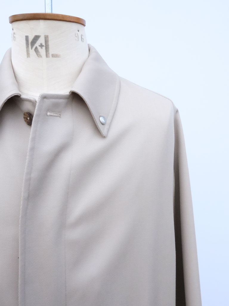 ブランドを代表するモデル〈HUDDERSFIELD BLT〉は、英国ハダースフィールド産の上質なウールキャバリーツイルを使用したバルカラーコート。キャバリーツイル特有の張りとコシを持ちながらも、滑らかな表面感と優雅なドレープを併せ持ち、美しいシルエットを描き出します。重厚感がありながら軽やかに羽織れるバランスは、テーラリングに深く精通したブランドならではの仕立てです。