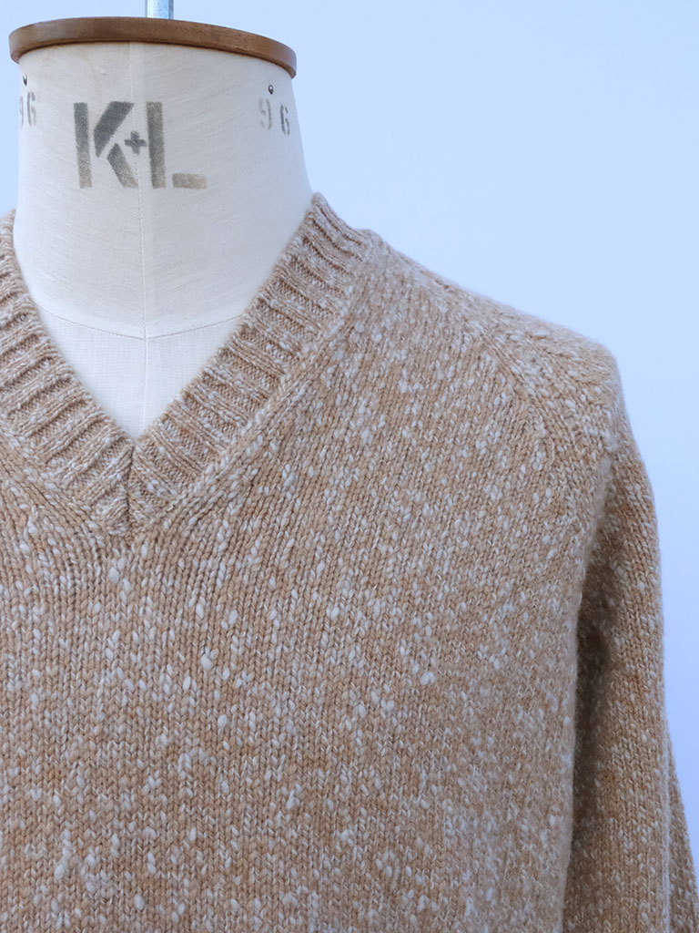 メランジ(杢糸)で編み立てられた表情豊かな風合いが、シンプルなデザインの中に奥行きと深みを演出。Vネックの開き具合も絶妙で、シャツを合わせても、一枚でさらりと着ても様になるバランスに仕上げられています。リブのテンションや袖口のフィット感など、長年ニット専業ブランドとして培ってきた細部へのこだわりも光ります。