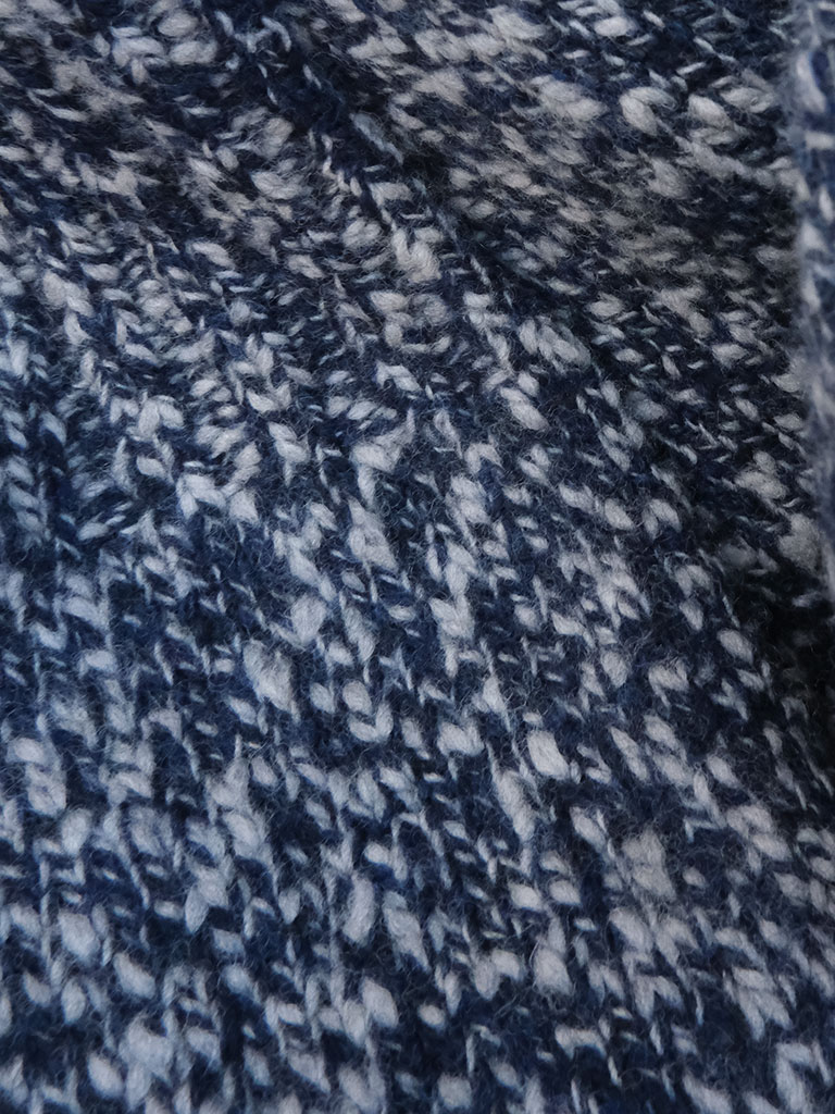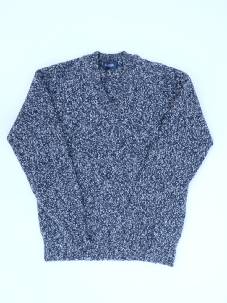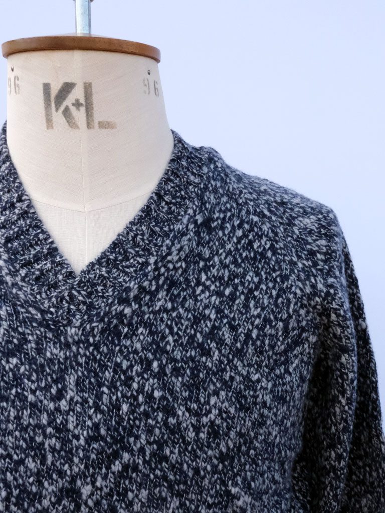メランジ(杢糸)で編み立てられた表情豊かな風合いが、シンプルなデザインの中に奥行きと深みを演出。Vネックの開き具合も絶妙で、シャツを合わせても、一枚でさらりと着ても様になるバランスに仕上げられています。リブのテンションや袖口のフィット感など、長年ニット専業ブランドとして培ってきた細部へのこだわりも光ります。