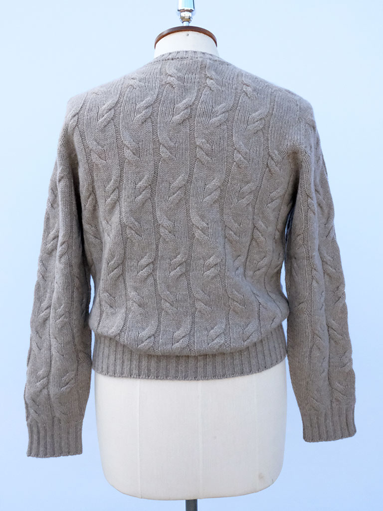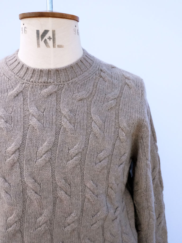 本作は、最高級カシミヤを贅沢に使用したケーブル編みのクルーネックセーター。繊維が非常に細く、しっとりとした滑らかさと軽やかな温もりを併せ持つ極上のカシミヤ糸を採用しています。ふっくらと空気を含んだ編み地が、着た瞬間から優しく身体を包み込み、抜群の肌触りと快適な着心地を実現。カシミヤならではの上品な光沢と柔らかな風合いが、装いにラグジュアリーなムードを添えます。