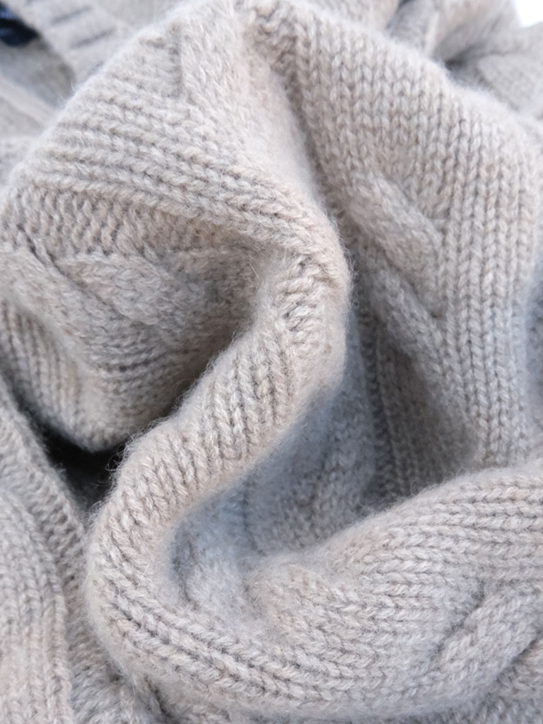 立体感のあるケーブル編みは、伝統的な技術を活かしながらも、ドルモアらしい洗練されたバランスで表現。重たさを感じさせないシルエットと程よいフィット感が、クラシックなデザインにモダンな軽やかさを加えています。