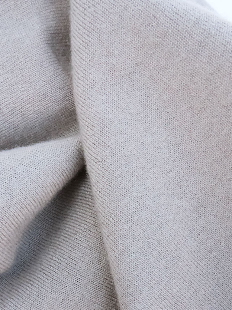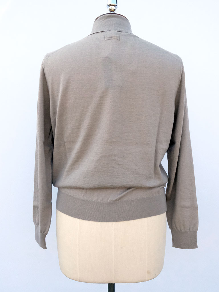 本作は、最高級のカシミヤを使用した30ゲージのタートルネックセーター。超極細糸を高密度に編み上げることで、驚くほどなめらかな肌触りと、軽やかで品格ある光沢感を実現しています。薄手ながら保温性に優れ、インナーとしても一枚着としても活躍。肩まわりのシームラインや身幅のバランスが絶妙で、身体に自然に沿う美しいシルエットを描きます。
