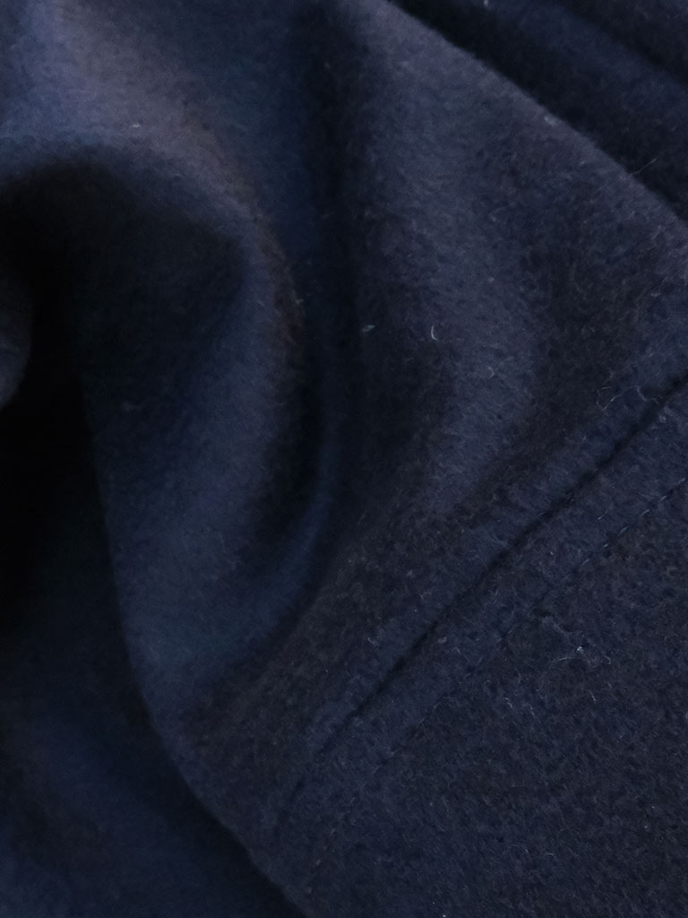 シャツ型のパターンをベースにしつつ、肩まわりや身幅には程よいゆとりを持たせ、動きやすさと美しいラインを両立した設計。ブルゾンとしての頼もしさを備えながら、軽く羽織るだけで決まりすぎず、抜けすぎない絶妙なバランスを生んでいます。前立ての作りや細かなステッチワークも丁寧で、装い全体をすっきりと整えるクリーンな印象を与えてくれます。