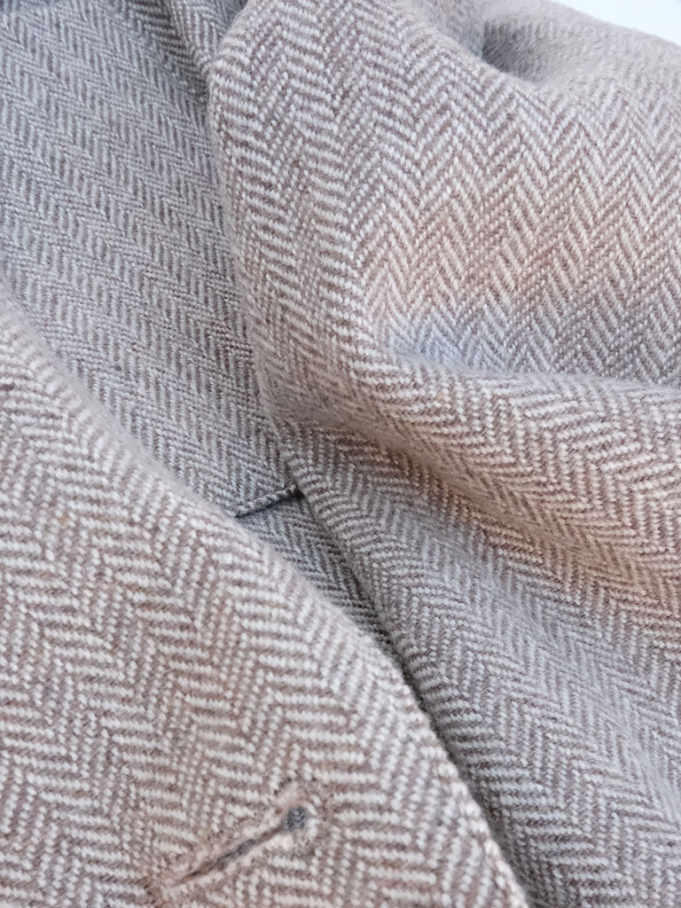 生地にはウールをベースにカシミヤをブレンドした上質素材を使用。ウールの持つ適度なハリと耐久性に、カシミヤ特有のなめらかさと上品な艶が加わり、見た目にも触れた瞬間にも高級感を感じさせます。ヘリンボーン織りは主張しすぎない繊細な表情で、無地感覚で取り入れやすく、コーディネートに奥行きを与えてくれるのも魅力です。