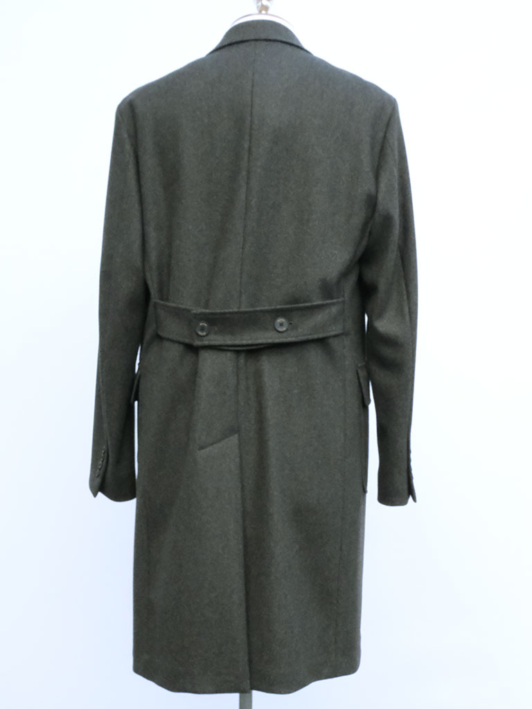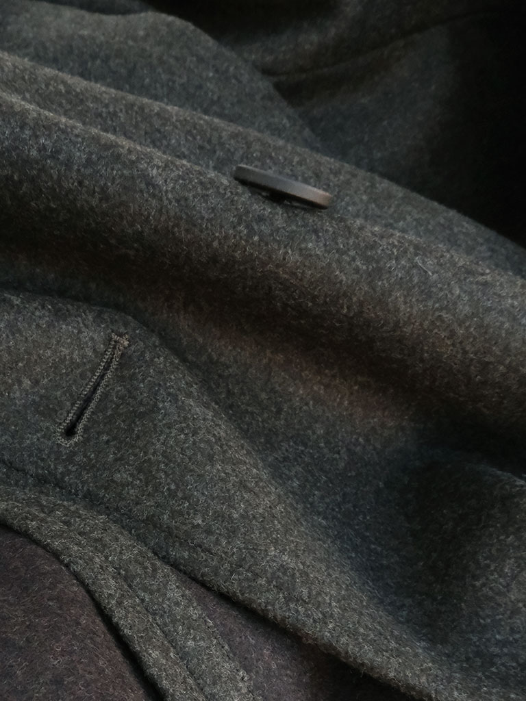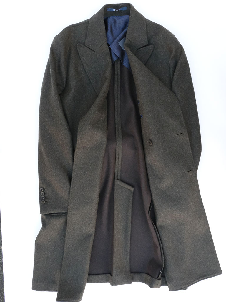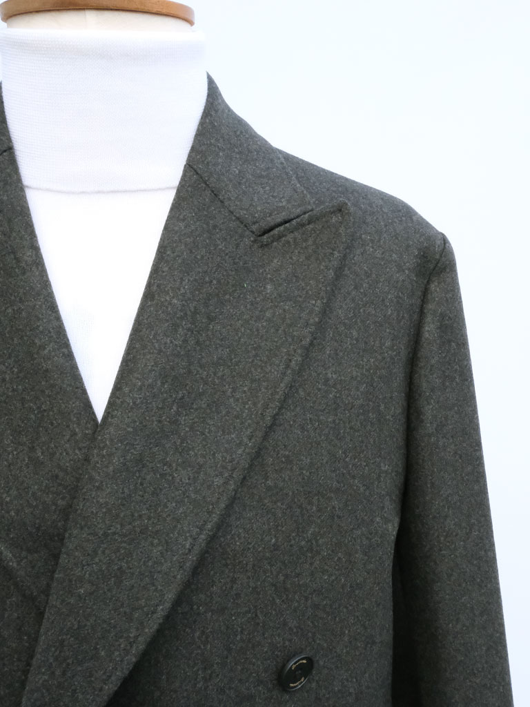 生地には上質なウールを贅沢に使用したダブルフェイス素材を採用。二重織りならではのふくらみと滑らかなタッチが特徴で、見た目にも触れた瞬間にも確かな高級感を感じさせます。しっかりとした肉感がありながらも、硬さはなく、軽やかに身体を包み込むような着心地を実現。仕立て映えする素材感が、コート全体の完成度を一段と高めています。
