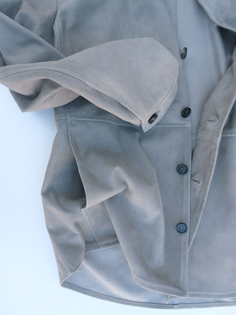 上質なラムスウェードを贅沢に使用したシャツジャケットは、軽やかさと高級感を兼ね備えた大人のための一着。きめ細やかでしっとりとした質感のスウェードは、柔らかな肌触りと自然な光沢を持ち、着るたびに身体に馴染んでいくのが魅力です。一般的なレザージャケットに比べて軽く、シャツ感覚でさらりと羽織れるため、季節の変わり目や気温差のある日にも活躍します。