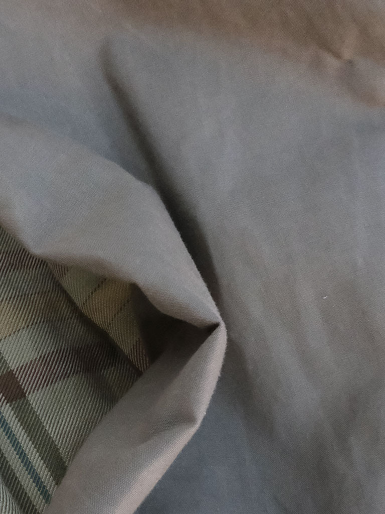 素材には、適度なハリとしなやかさを持つワックスコットンを採用。表面にほんのりとした艶を帯びており、カジュアルでありながらも品のある表情を演出します。撥水性にも優れているため、急な天候の変化にも対応可能。着用を重ねることで生まれるシワやアタリが、唯一無二の風合いへと育っていくのも魅力です。