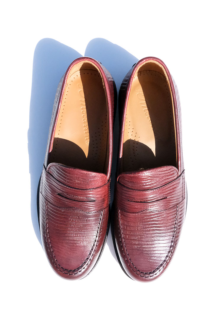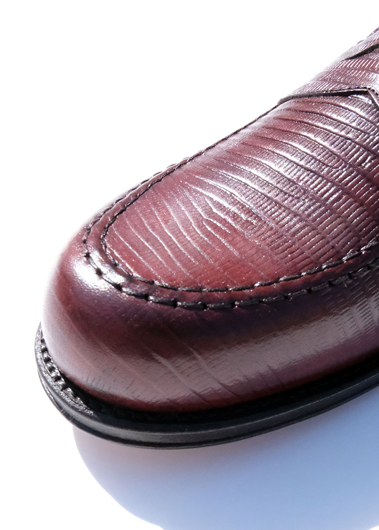 アッパーには上質なレザーにリザードの型押しを施し、さりげない光沢と奥行きのある表情を演出。本物のエキゾチックレザーのような存在感を持ちながらも、日常使いしやすいバランスに仕上げられています。シンプルなローファーのフォルムに奥行きを与え、コーディネートに程よいアクセントをプラスします。