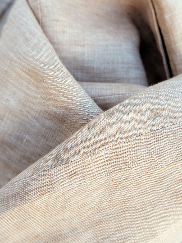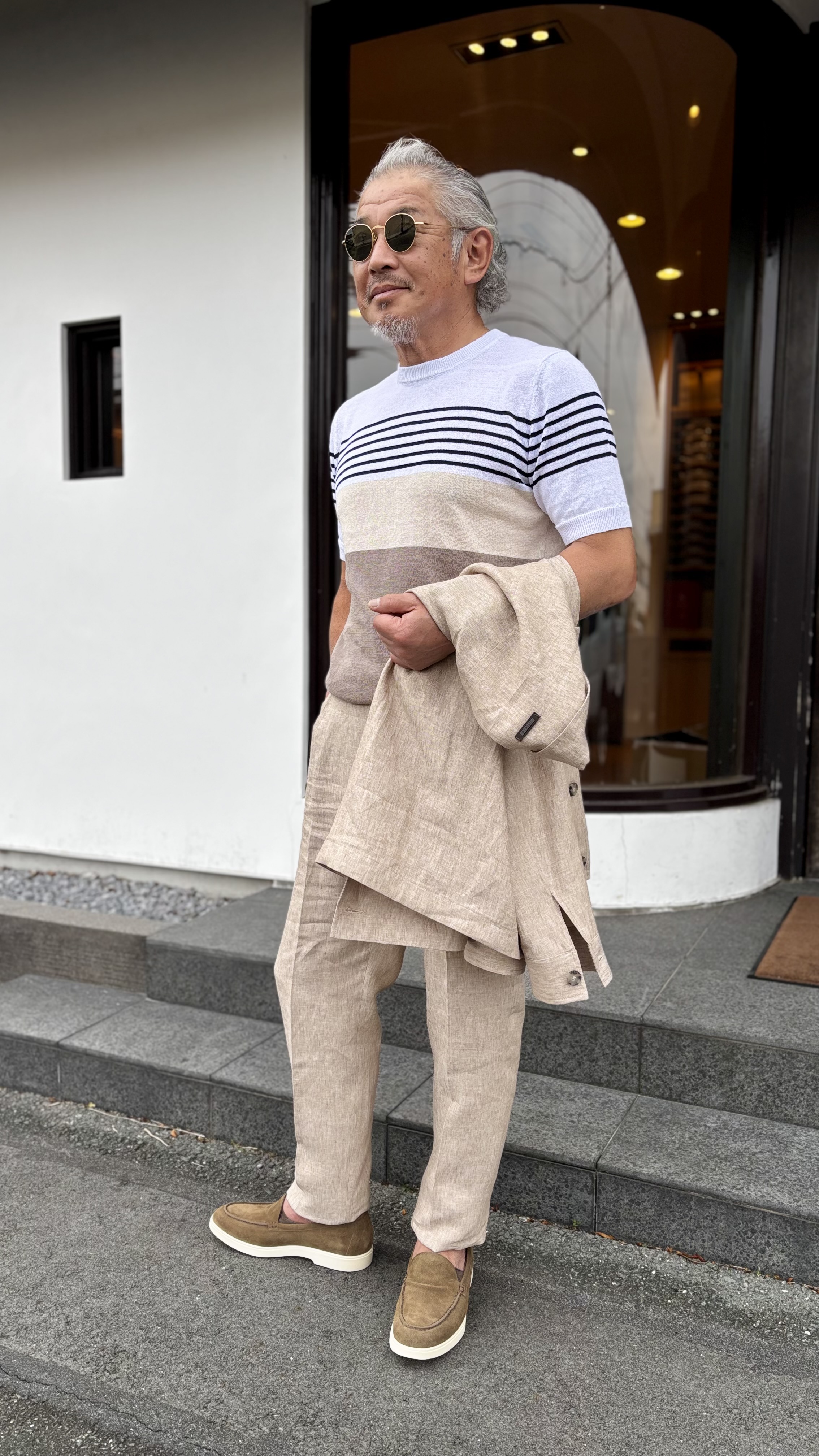 素材には上質なリネンを採用し、通気性と吸湿性に優れた快適な着心地を実現。リネン特有のドライなタッチと軽やかな風合いが、春夏シーズンに心地よい清涼感をもたらします。また、着込むほどに柔らかさと風合いが増し、経年変化も楽しめるのが魅力です。